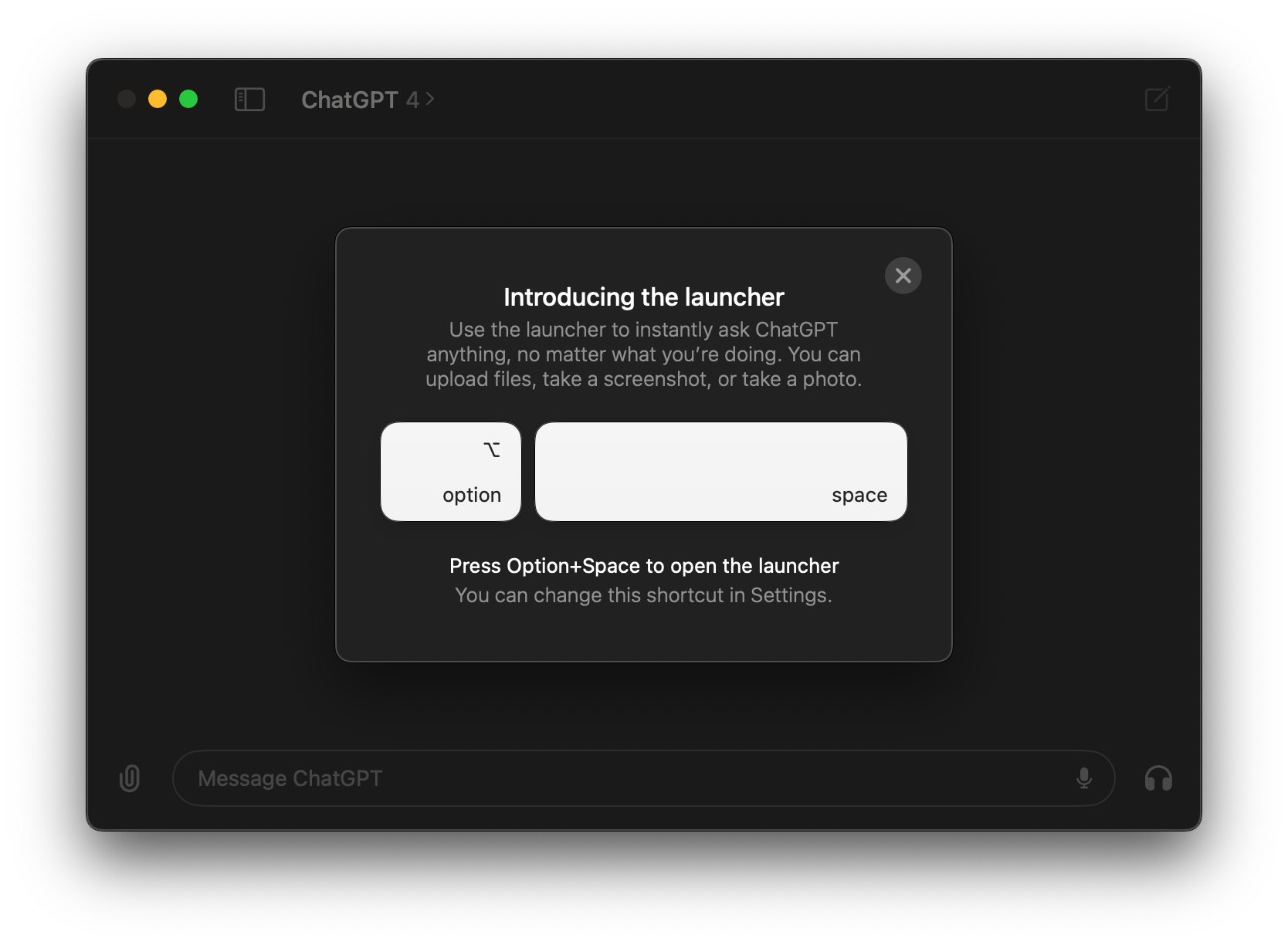 You have the 'launcher', which is a quick way to send a message to ChatGPT to start a chat. Default short cut is Option+Space.